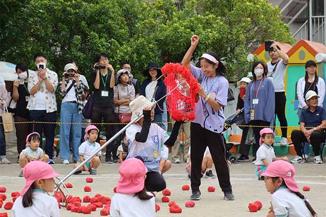 10月4日(水)にファミリー保育での玉入れ大会が行われました。ファミリーに分かれてのチーム戦なので、とても盛り上がりましたよ。年長さんたちがしっかりリードし、小さい学年の子も必死に投げて頑張っていました。
