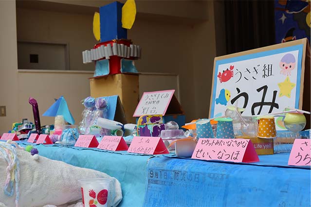 今年のテーマは『うみ』ということで、この広いテーマから子どもたちが思い思いの発想で作品作りに挑戦しました。幼稚園の水槽のおさかなたちも、作品を作るうえで非常に参考になったようです。
