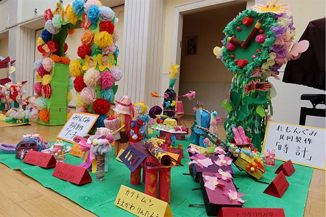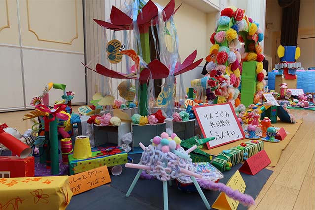 今年のテーマは『どんりゅっこまつり』です。お祭りならではの色々な屋台、そしてそれらお店を楽しむ子どもたち自身の姿を作品として表現しました。紙粘土や各家庭から持って来た素材を利用し、想像を膨らませながら楽しく作れましたね。