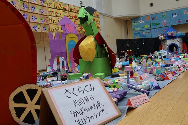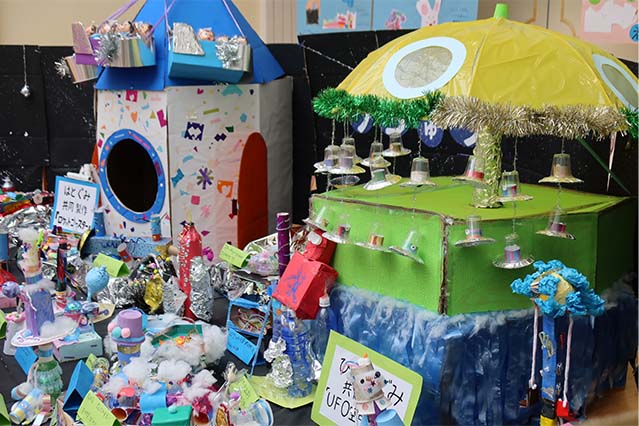 今年の作品展のテーマは『みらいのかすかべ』です。様々な材料を切ったり、貼ったり、巻き付けたり…。世界に一つだけの作品が出来上がりました。「未来の春日部にはこんな乗り物が走ってるかも」や「こんな建物や食べ物があるかも」と、こんなものがあったらいいなという願望も交えつつ、考えを巡らせた楽しい工作となったようです。