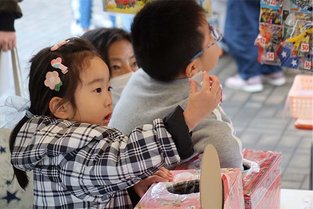 二階では、楽しいマジックショーが行われました。不思議で面白いマジックに子どもたちも笑顔がいっぱいでした。パーム広場ではくじや金魚すくい、ポップコーンやわたあめの販売があり、多くの人でにぎわいました。