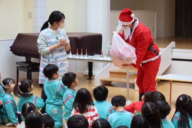 最後にはサンタさんから、赤いブーツに入ったお菓子のクリスマスプレゼントをもらい、笑顔でいっぱいです。